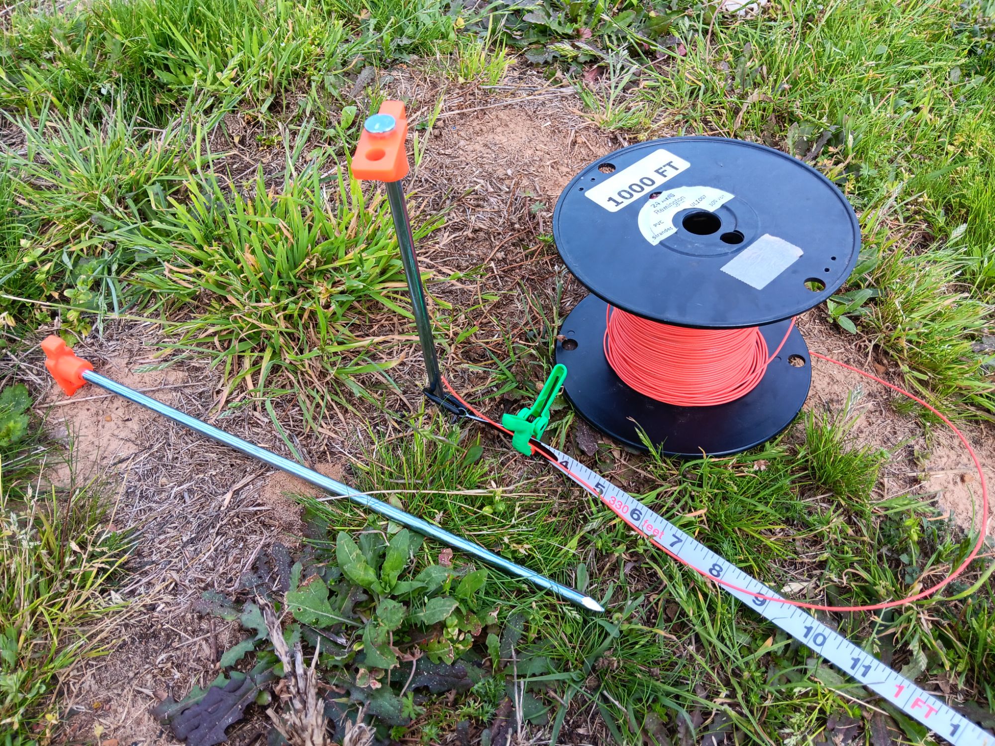 Next, I’ve taken my reel of wire and gone around my tent stakes eight times, giving me a total of 160 feet unspooled.