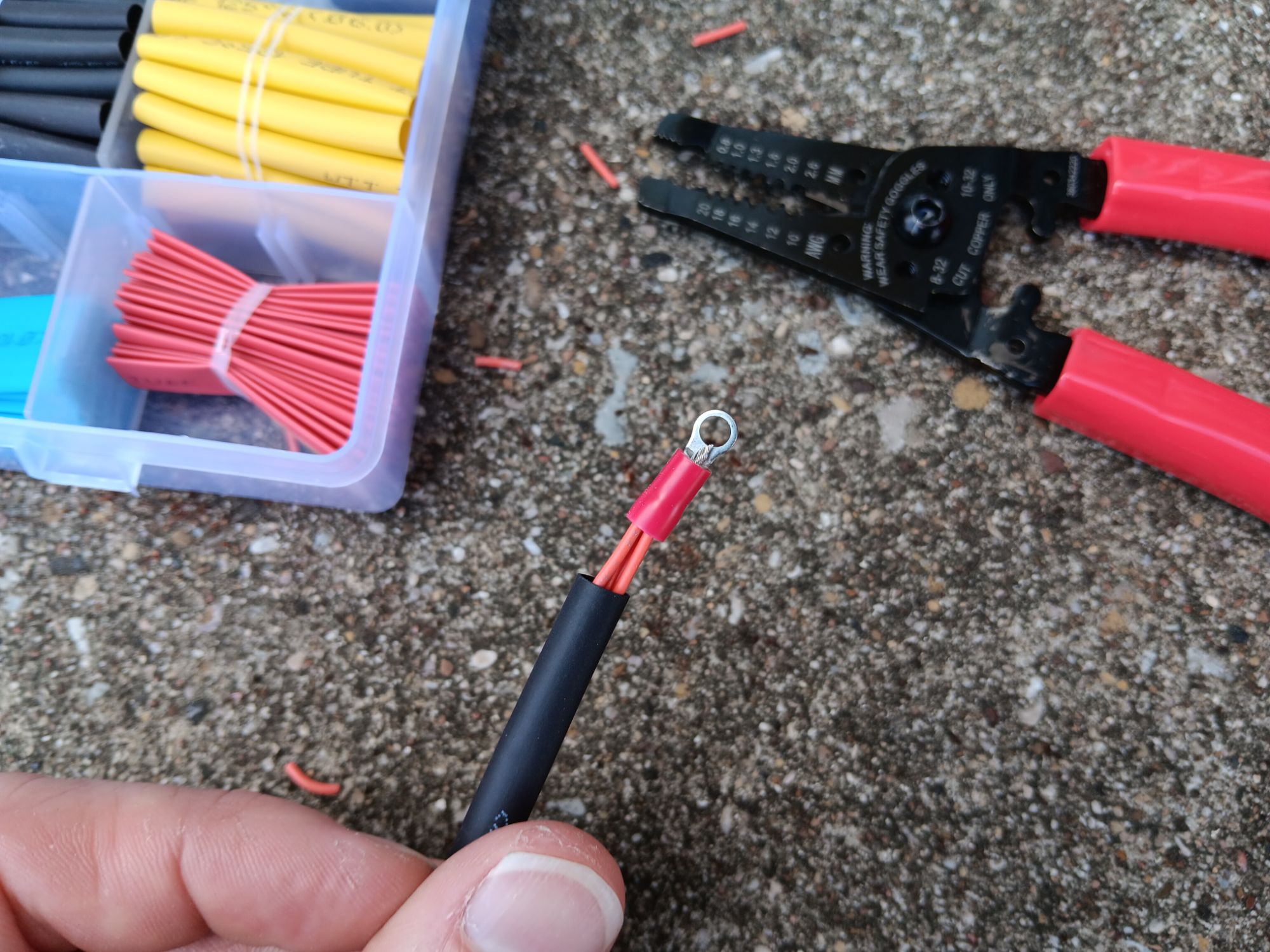 Then I take a piece of heat shrink, slip it over the four wires, add a ring terminal, and crimp it into place. The ring terminal is sized 16-22 awg.