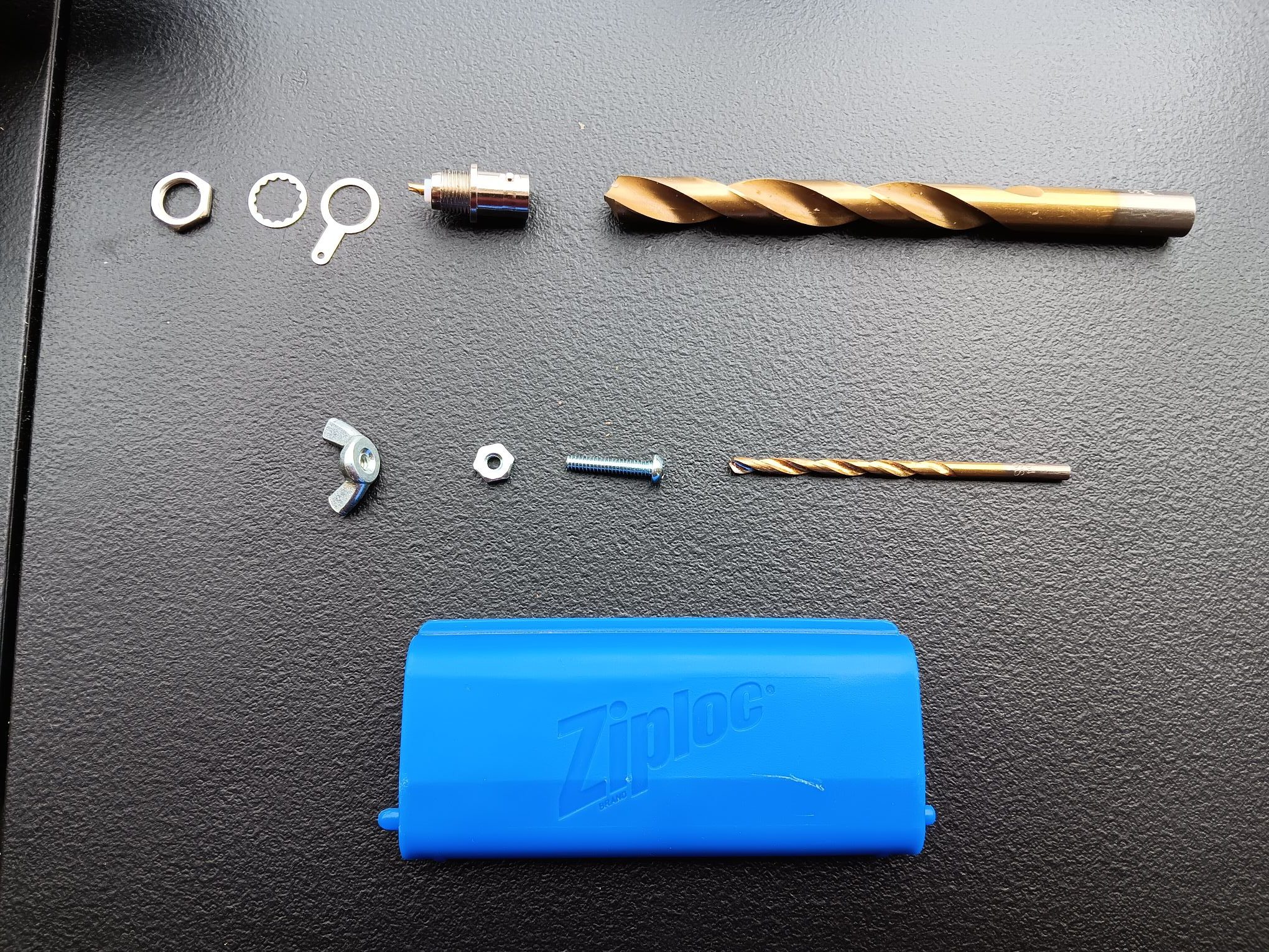 For this step, I chose a 3/8 bit for the BNC connector hole and a 1/8 bit for the #6 bolt. Hold the bits up next to the hardware to ensure that they are the correct size.