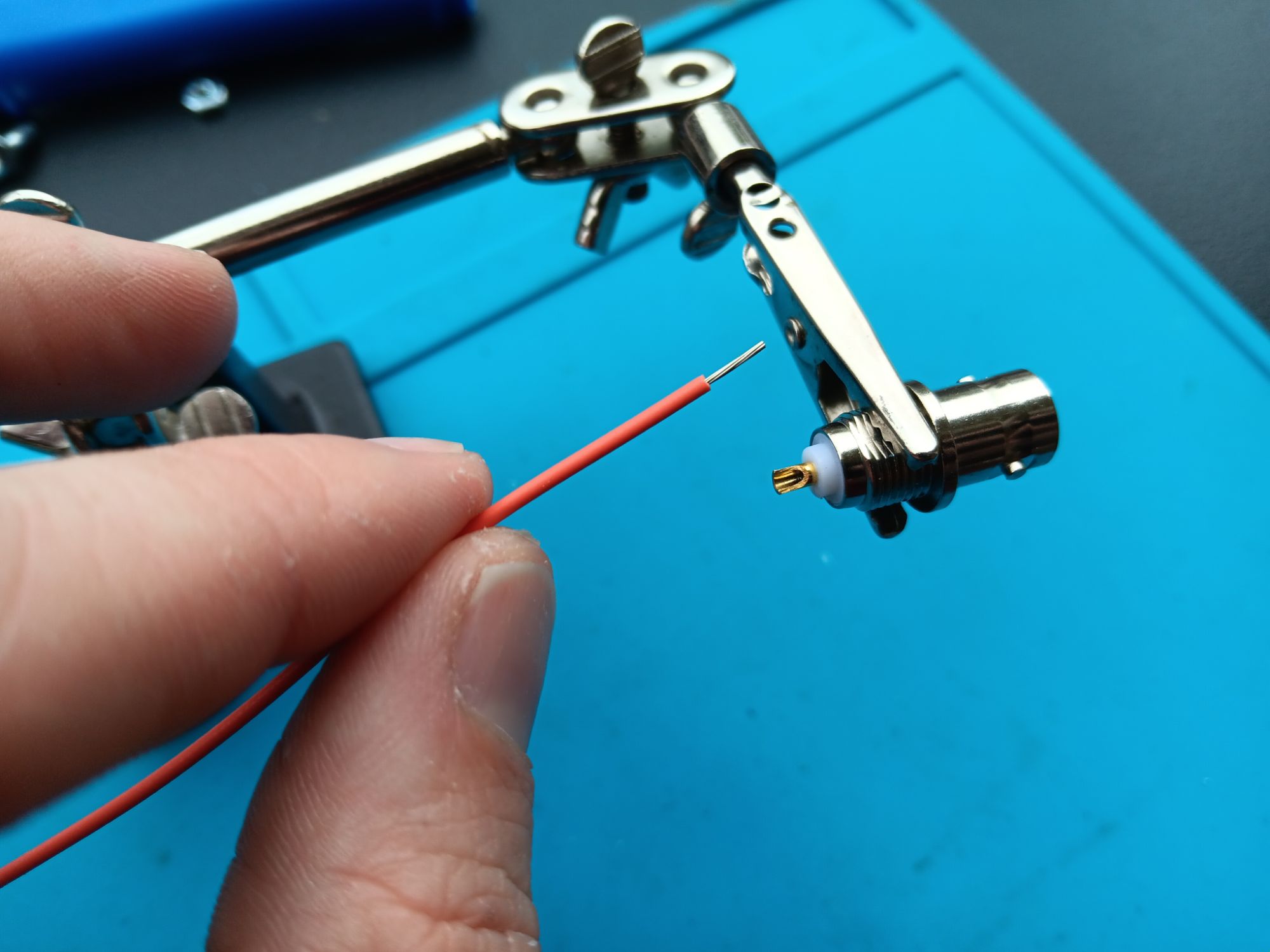 Next, strip back the wire enough to fit into the BNC.