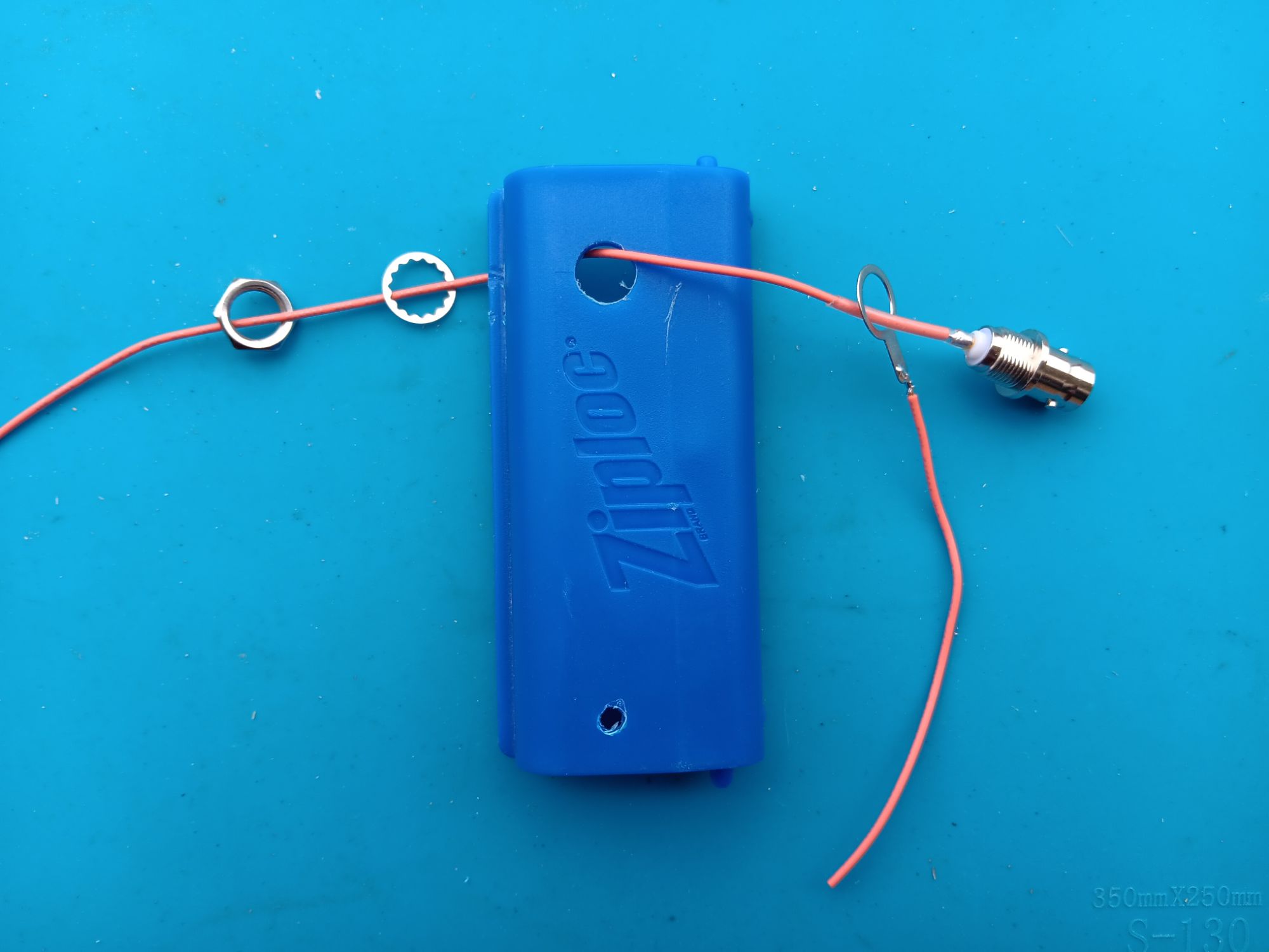 As you can see, I have drilled one hole for the BNC connector, one hole for the ground plane mounting bolt, and two holes above the BNC connector hole. These two holes are for threading through the radiating element for some mechanical strength.