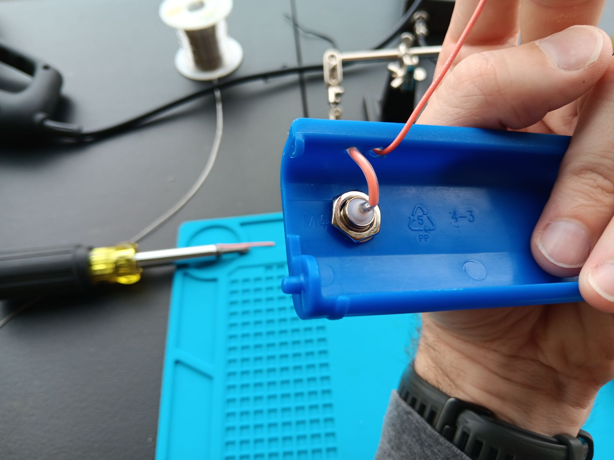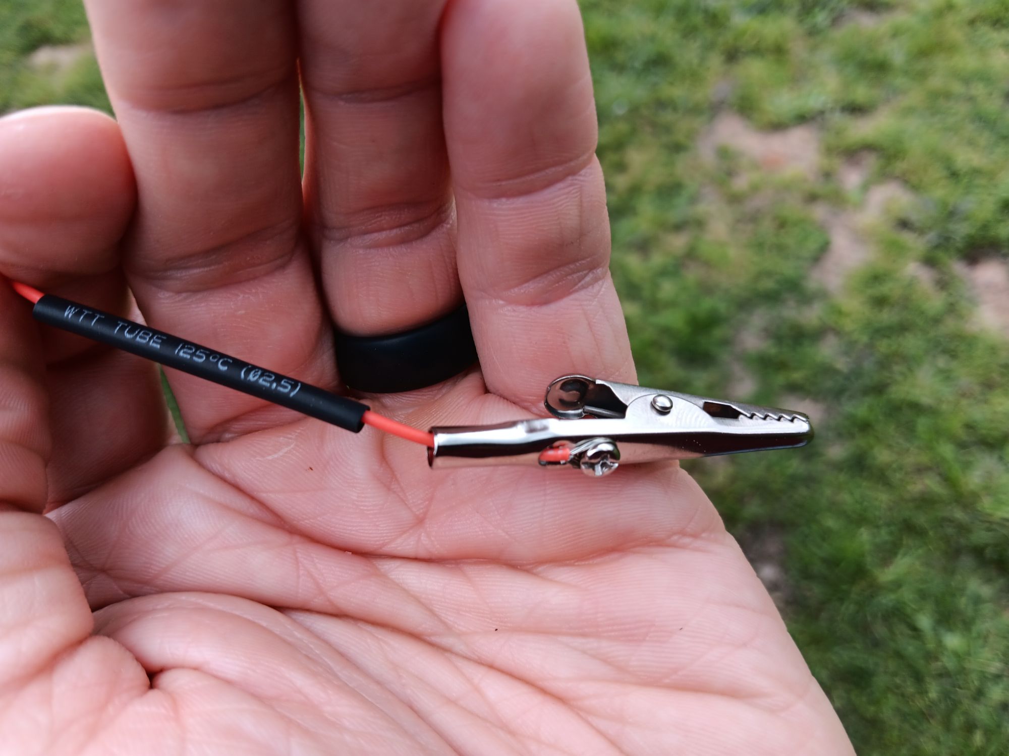Find a small piece of wire, some three or four inches in length. Strip it, insert it into the ring, then wrap the wire back onto itself for strength. Then, solder it. I’ve not added heat shrink here since there is little risk of moving, therefore damaging this part once installed.