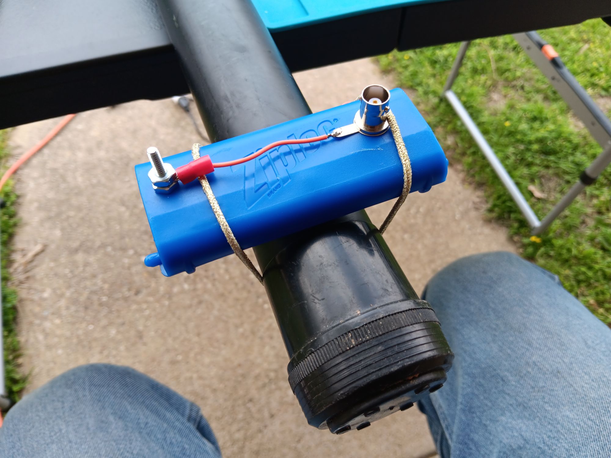 It may be hard to tell from this photo, but the bungee cord is a hair tie. The loop goes underneath the ground jumper. The opposite side of the loop is then wrapped around the mast, then slipped over the feedpoint plate again next to the BNC.