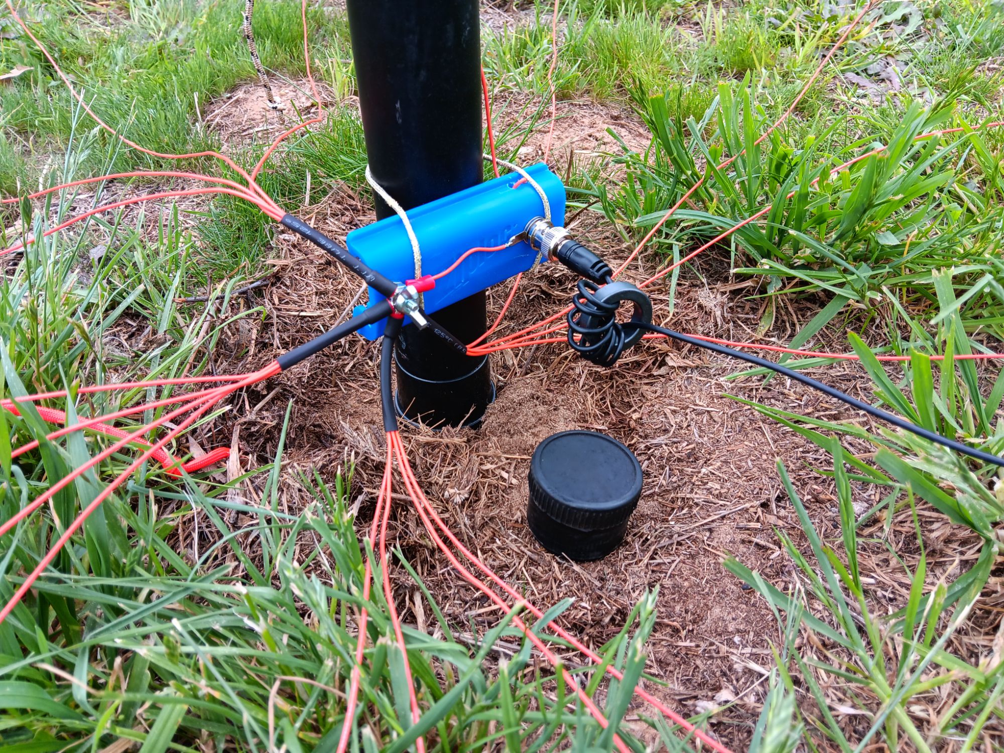 As a ground plane, I have put down sixteen 10ft radials. These radials come out to just over two wavelengths on 20m, the lowest band of operation for this antenna. This isn’t a random number of radials that I have landed upon. I’m standing upon the shoulders of Rudy Severn’s genius article (N6LF).