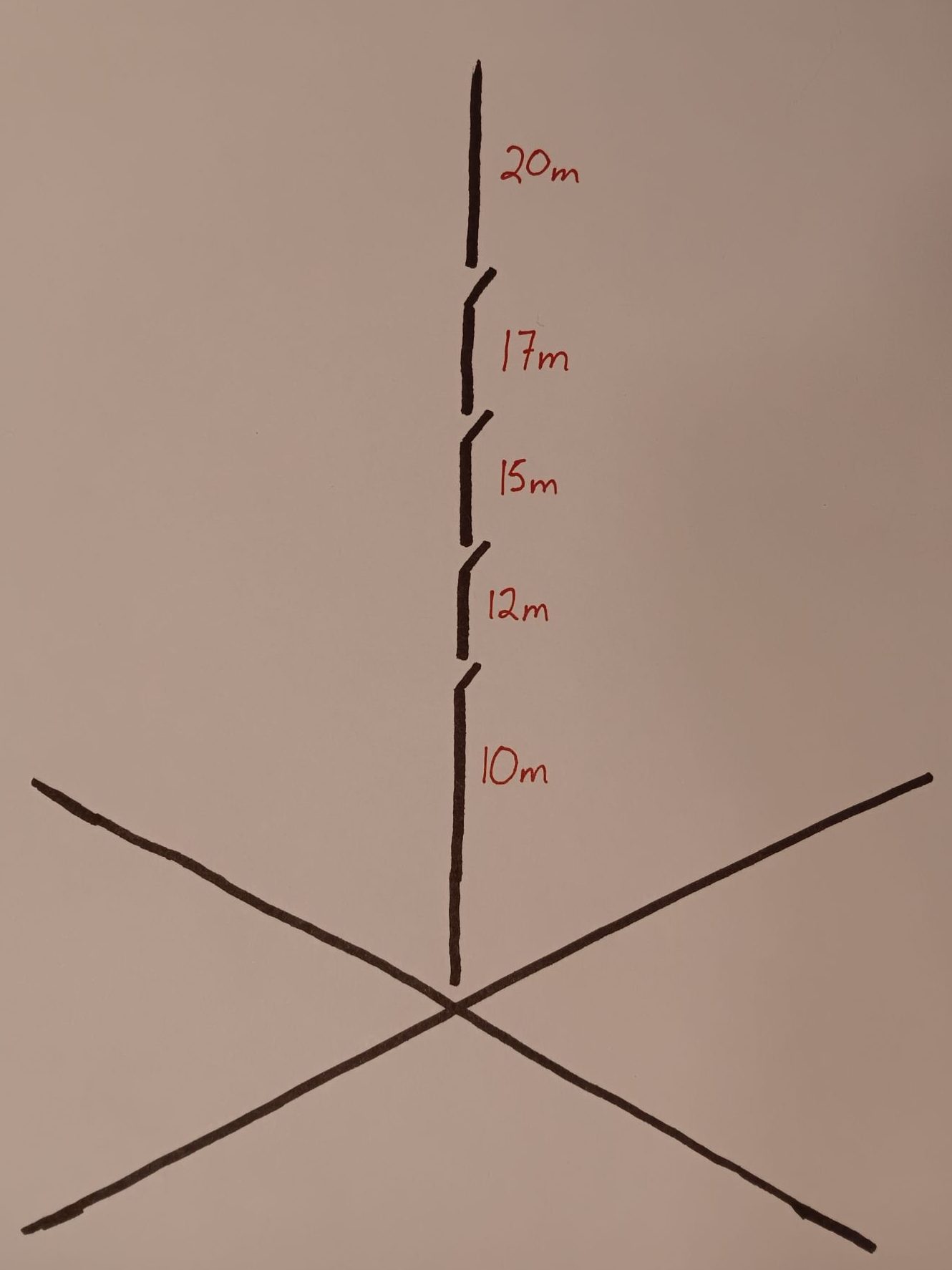 In short, I’ve built a vertical antenna for 10m, 12m, 15m, 17m, and 20m. This is accomplished through a series of links which create a resonant quarter wave for each desired band.